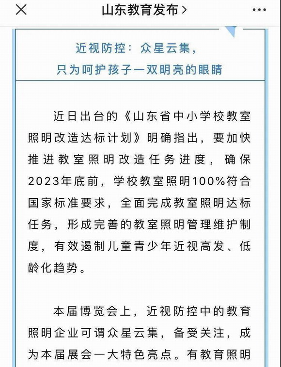 適逢山東省教育廳、山東省衛健委頒發《山東省中小學校教室照明改造達標計劃》。山東省教育廳官方微信展前、展中均對展會進行相關報道。雷曼-拓享科技憑借十幾年豐富制燈經驗和過硬的產品品質,在此次展會提供了最優的護眼產品和解決方案,欲服務山東省中小學校,保護學生視力健康,助力山東省近視防控。