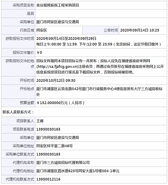 開標地點: 廈門市湖里區云頂北路842號廈門市行政服務中心4樓信息發布大廳三方誠信收標處