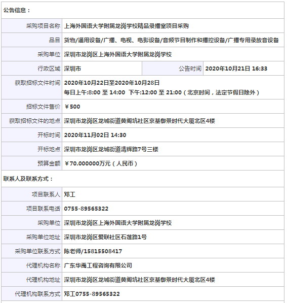 采購項目名稱: 上海外國語大學附屬龍崗學校精品錄播室項目采購
