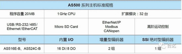 另外,AS500系列也內(nèi)置16路DI/8路DO、2路增量型編碼器和1路SSI 絕對型編碼器。