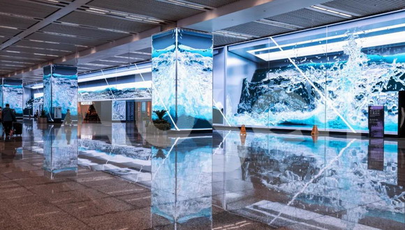 走出機場航站樓,在樞紐中心迎面而來的U型屏和兩側的大屏,讓旅客無論是從哪個角度都能感受到撲面而來的海浪。