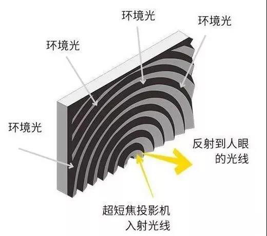 黑柵幕抗光幕,其實就是利用一種特殊工藝將截面制作為鋸齒形的一種屏幕。黑柵結構分為黑白兩色棱鏡結構,黑色為吸光層,專門用來吸收來自頂部以及兩側的光線,白色反光層則是用來反射來自投影機的投影光線。