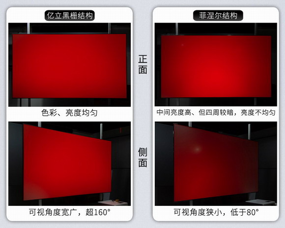菲涅耳屏幕抗光效果好,但是可視角度小。并且由于光學結構更為復雜,只能做成不能卷曲的硬屏。無論是運輸還是安裝難度都會比黑柵幕布要高上不少,所以其目前市售最大尺寸也只有100英寸。同時由于將從屏幕兩側的光線進行了吸收處理,所以菲涅爾的可視角度相對黑柵幕也有非常大的縮減。