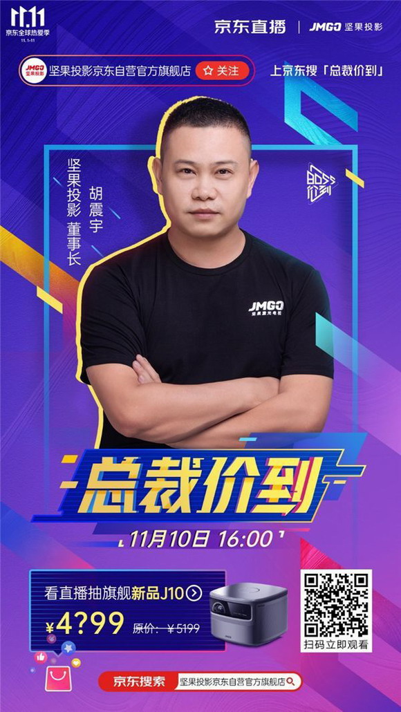 11月10日下午17:00深圳火樂科技(JMGO堅果投影)董事長胡震宇先生將帶著超強福利沖擊波來到京東直播間,直播中有百元E卡等專屬寵粉福利,繼續(xù)點燃京東11.11全球熱愛季掃貨熱賣高潮!