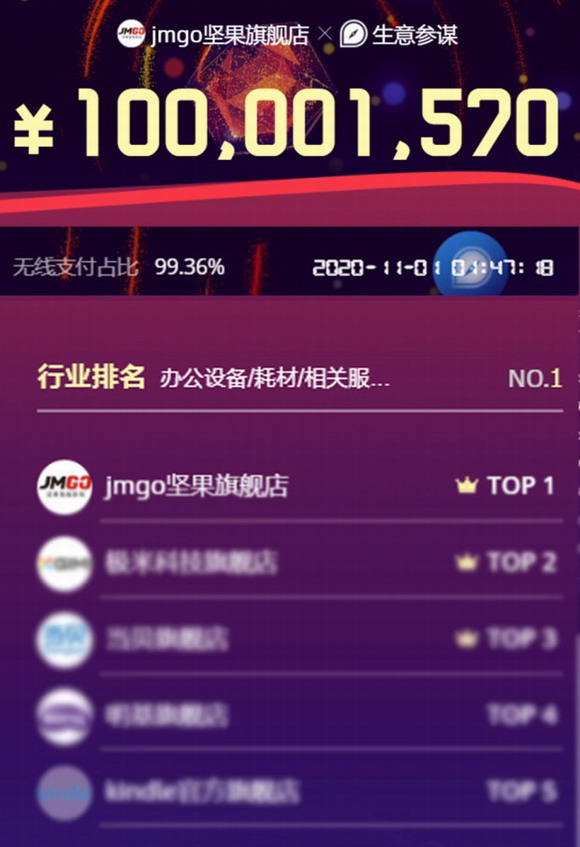 而11 月 1 日零點(diǎn)開始,雙11開門紅正式開跑,3C數(shù)碼賽道的知名投影儀品牌JMGO堅(jiān)果投影表現(xiàn)十分搶眼,開局便不負(fù)眾望、不僅再次取得“單品銷售冠軍”、延續(xù)“四冠王”戰(zhàn)績,更是創(chuàng)造全新新紀(jì)錄、天貓平臺2小時(shí)內(nèi)銷售突破1個(gè)億! 再次成功登頂投影儀類目榜首,斬獲行業(yè)排名第一的好成績,銷售紀(jì)錄又一次被刷新!