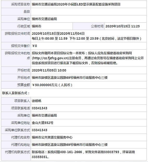 福州市交通運輸局2020年小間距LED顯示屏及配套設施采購項目招標公告