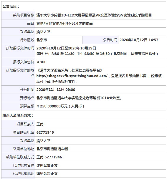 清華大學(xué)小間距3D-LED大屏幕顯示及VR交互體驗教學(xué)/實驗系統(tǒng)采購項目公開招標(biāo)公告