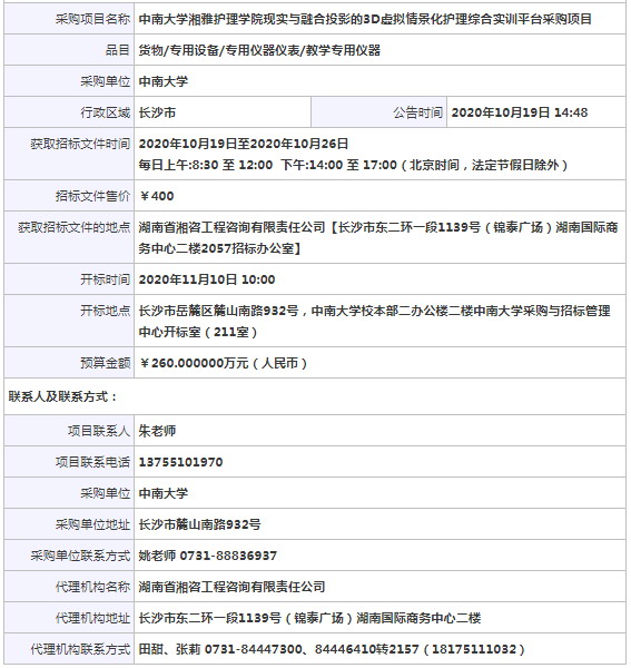 中南大學湘雅護理學院現實與融合投影的3D虛擬情景化護理綜合實訓平臺采購項目招標公告