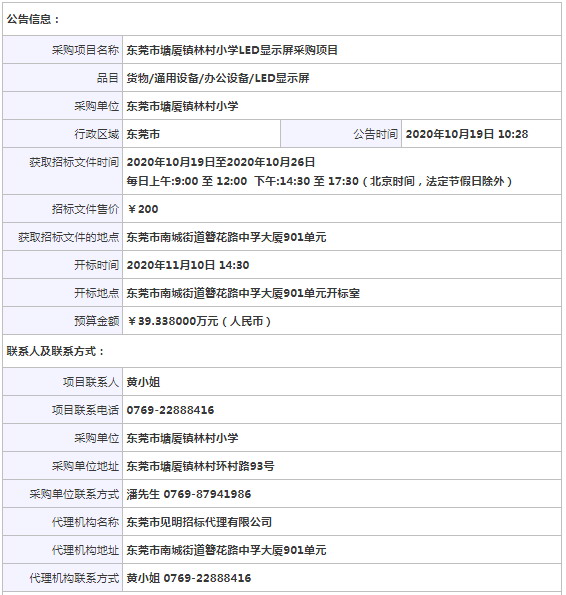 采購項目名稱: 東莞市塘廈鎮(zhèn)林村小學(xué)LED顯示屏采購項目
