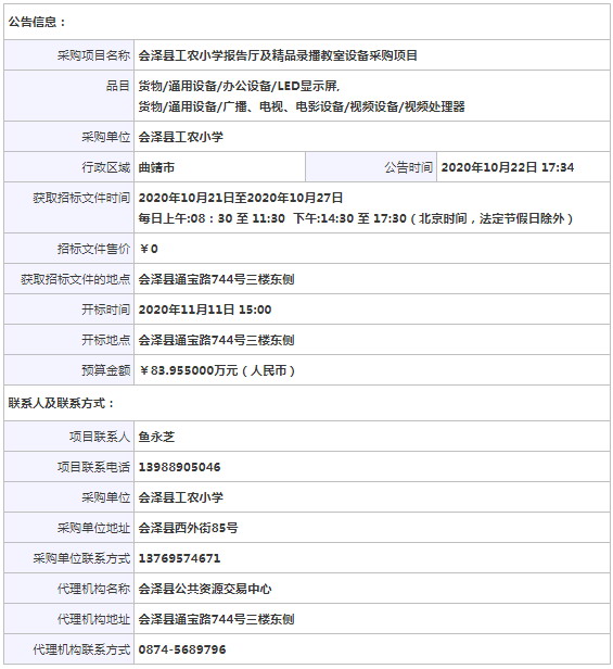 會澤縣工農小學報告廳及精品錄播教室設備采購項目招標公告