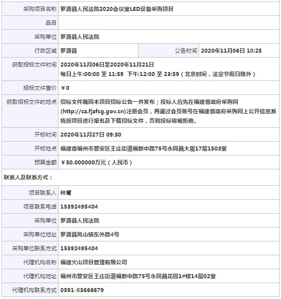 采購項目名稱: 羅源縣人民法院2020會議室LED設備采購項目采購品目: 預算金額: ¥50.000000萬元(人民幣)獲取招標文件時間: 2020年11月06日至2020年11月21日獲取招標文件地點: 招標文件隨同本項目招標公告一并發(fā)布;投標人應先在福建省政府采購網(wǎng)(http://cz.fjzfcg.gov.cn)注冊會員,再通過會員賬號在福建省政府采購網(wǎng)上公開信息系統(tǒng)按項目進行報名及下載