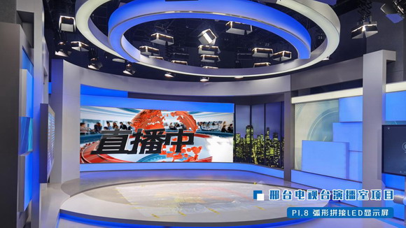 值得一提的是,此次應用在邢臺電視臺演播室的Voury卓華小間距P1.8LED顯示屏,不僅具備小間距顯示系列產品無縫拼接、超高清顯示的優異性能,其最大亮點是采用了內弧結構,這種拼接安裝雖有一定難度,但Voury卓華工程師早已克服現場施工技術難題,保證了LED大屏幕弧度平滑無縫,使得即使在大弧度應用場合也能完美顯示,獲得了相關領導的高度評價。