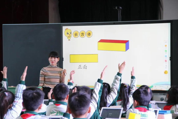 二年級的侯叔娟老師向與會嘉賓們展現了一堂生動有趣的數學課《觀察物體》。侯老師在教學過程中結合希沃易課堂課件推送、截屏推送等功能,讓學生在平板上按立體圖形的特征進行分類,通過實時互動,加強了學生們的參與感和專注度。