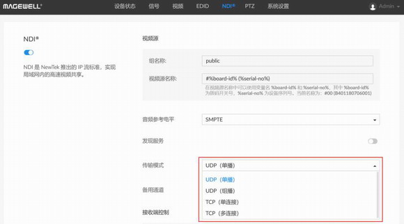 想要設置傳輸模式的選項,用戶需要登錄編碼器Web UI,在“NDI®”頁簽中點擊“傳輸模式”欄右側箭頭,在彈出的下拉欄中選擇一種傳輸模式,下拉到頁簽最后,點擊“應用”即可。默認設置是TCP(多連接)。