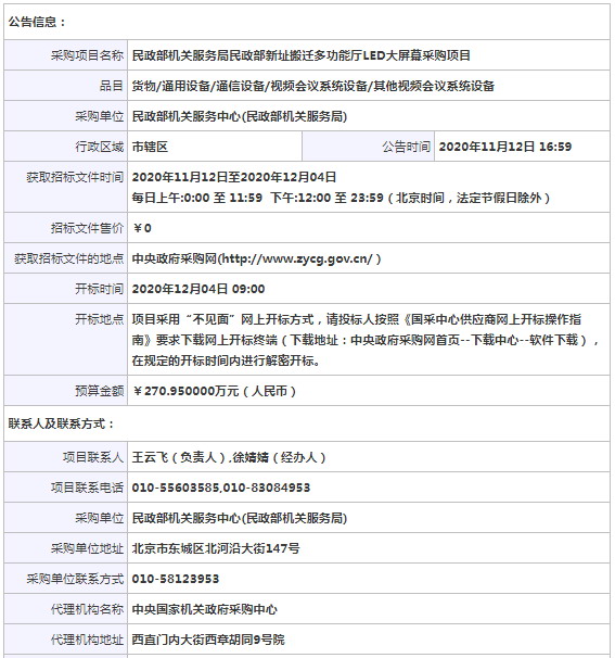 采購項(xiàng)目名稱: 民政部機(jī)關(guān)服務(wù)局民政部新址搬遷多功能廳LED大屏幕采購項(xiàng)目采購品目: 貨物/通用設(shè)備/通信設(shè)備/視頻會議系統(tǒng)設(shè)備/其他視頻會議系統(tǒng)設(shè)備預(yù)算金額: ¥270.950000萬元(人民幣)獲取招標(biāo)文件時間: 2020年11月12日至2020年12月04日獲取招標(biāo)文件地點(diǎn): 中央政府采購網(wǎng)(http://www.zycg.gov.cn/)