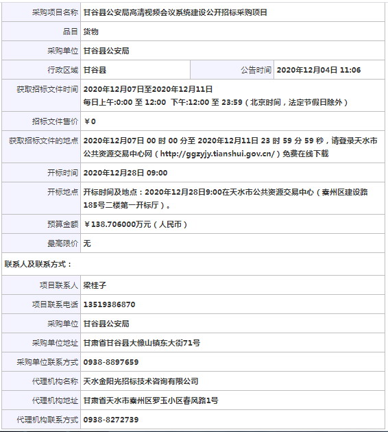 采購項目名稱: 甘谷縣公安局高清視頻會議系統建設公開招標采購項目