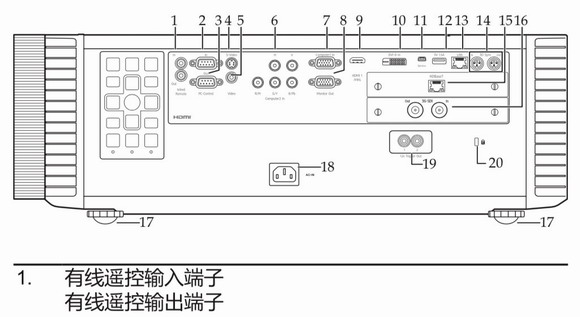Beverly系列投影機(jī)即提供有線遙控輸入接口(圖示中標(biāo)1處),還提供有線遙控輸出接口,實(shí)現(xiàn)投影機(jī)之間的串接。