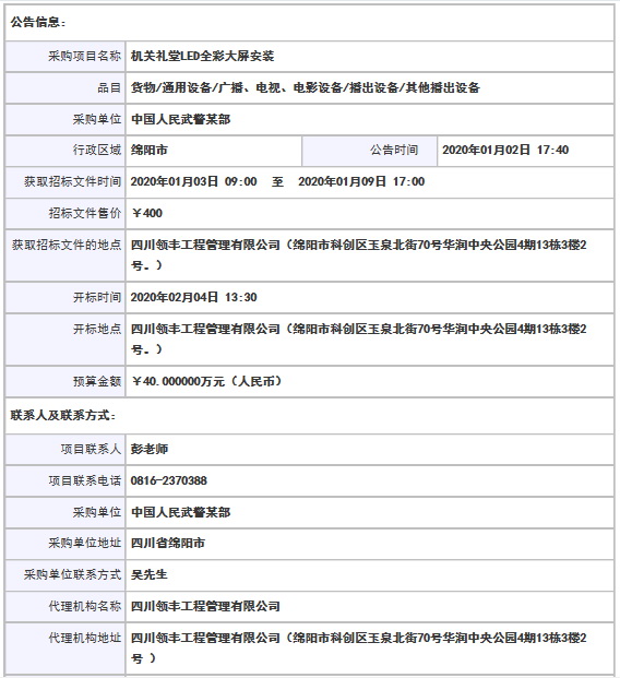 采購項目名稱: 機關禮堂LED全彩大屏安裝