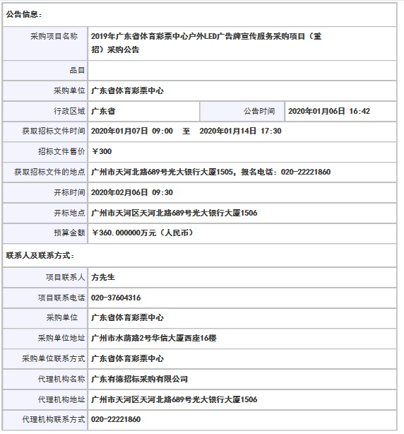 采購項目名稱: 2019年廣東省體育彩票中心戶外LED廣告牌宣傳服務采購項目(重招)采購公告