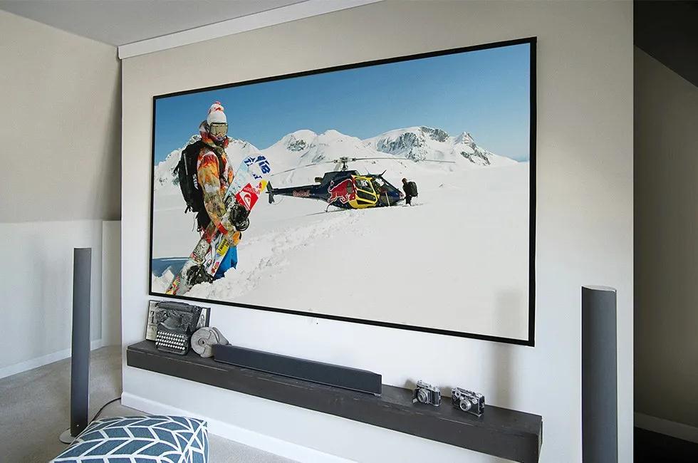 如果想在白天獲得較好的觀影體驗,則可以拉上窗簾或是選擇擁有抗光效果的投影幕布搭配流明和對比度較高的投影機,而億立的翼王AEON系列畫框幕則完全可以滿足這種需求。億立AEON系列畫框幕采用了進口黑柵表面微型結構抗光幕布,有效阻擋環境光的同時也擁有超高的對比度與色彩飽和度,搭配時尚的黑色超窄邊框,令人獲得身臨其境的觀影體驗。