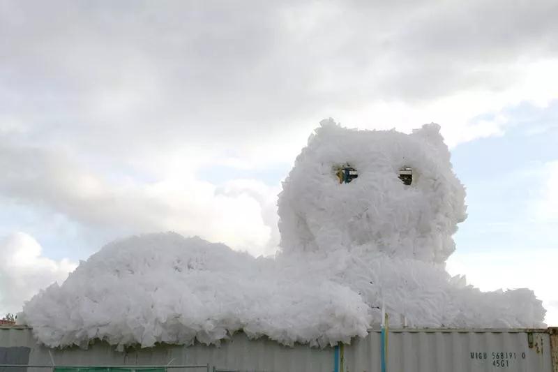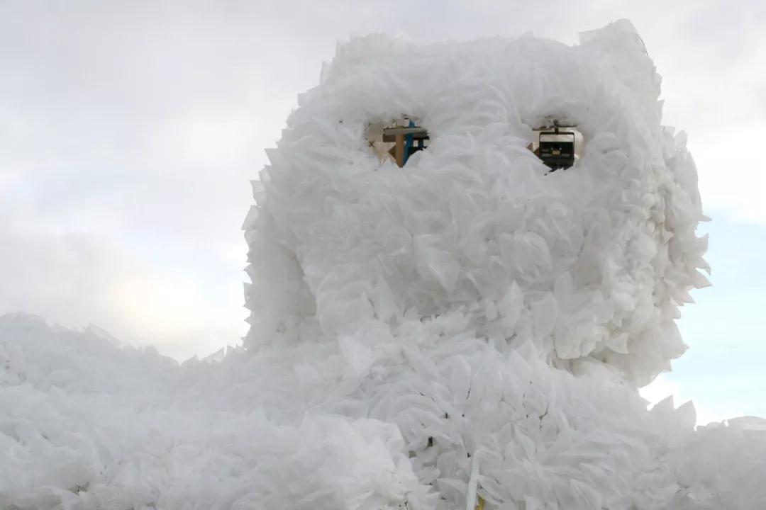 裝置由鋼材組合搭建而成,用九千個白色塑料袋覆蓋。為了在夜晚照亮雕塑,貓的頭部安裝了激光機和無線網(wǎng)絡。
