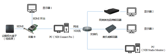 在搭建完以上測(cè)試環(huán)境后,我們將解碼端軟件編碼嘗試切換成Magewell Pro Convert HDMI 4K Plus編碼器(下面簡(jiǎn)稱(chēng)“美樂(lè)威NDI®編碼器”)和同類(lèi)其他品牌編碼器進(jìn)行硬件編碼測(cè)試,其他設(shè)備不做改變。切換后的設(shè)備搭建如下圖: