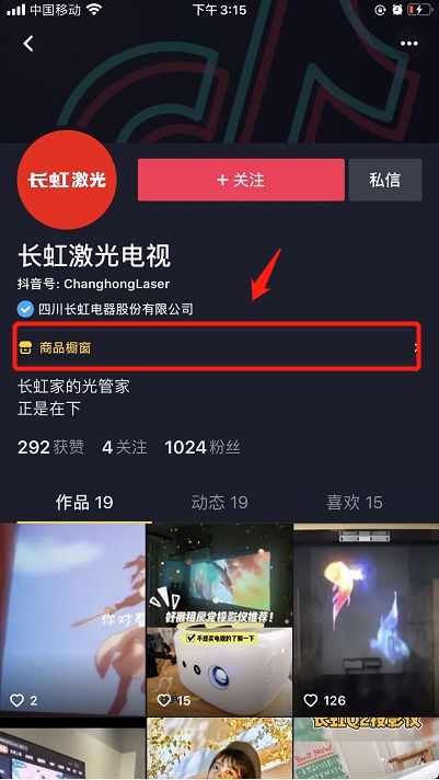 點擊進入長虹激光電視主頁,我們的抖音小店就“藏”在賬號信息下面的“商品櫥窗”里。