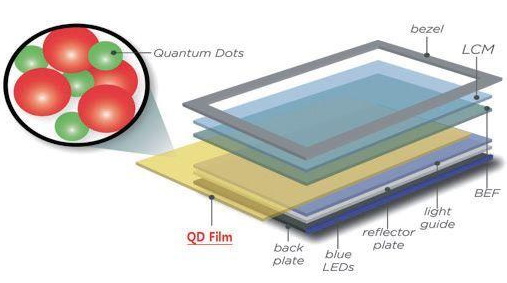 QD LED,也就是量子點背光,這是一種前幾年興起的背光源,本質上也是LED,只是采用了肉眼看不到極其微小的無機納米晶體。每當受到光的刺激,量子點便會發出非常純凈的有色光線,量子點材料之所以能作為背光源,是因為它的色彩純凈。量子點背光的優點是色彩飽和度非常高,色彩表現能輕松匹敵RGB LED,并且價格也要比RGB LED更低,不過要高于普通LED背光的顯示設備。