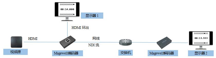 解碼端使用的Magewell Pro Convert for NDI® to HDMI(下文簡稱“美樂威NDI®解碼器”)也連接到相同的局域網,解碼后的畫面通過HDMI接口輸出到顯示器2顯示。