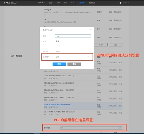 在搭建完以上測試環境后,我們登錄美樂威解碼器的Web UI(用戶可通過多種方式來訪問Pro Convert系列產品的Web UI,詳情見http://cn.magewell.com/kb/005030002/detail),在數據流頁面手動添加通道,即在“預設”中點擊“添加”即可選擇不同傳輸協議,在彈出界面“緩沖時間”中輸入緩沖時間值。此外還可以自動獲取NDI®數據流通道,在 “NDI®數據源”的“緩沖時間”中輸入緩沖時間值進行統一設置,我們嘗試不同的數值(20ms至120ms,每隔10ms變化一次),并記錄測試結果如下。
