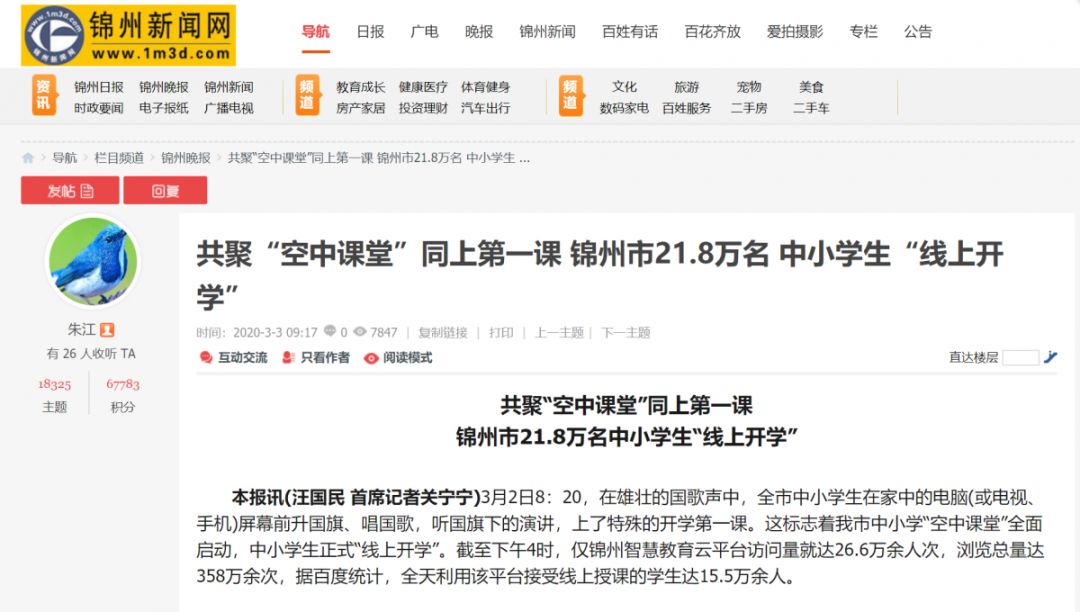 當(dāng)天,錦州智慧教育云平臺訪問量達(dá)26.6萬余人次,瀏覽總量達(dá)358萬余次,還受到錦州新聞網(wǎng)、錦州晚報(bào)、人民網(wǎng)、騰訊網(wǎng)等眾多權(quán)威媒體網(wǎng)站的爭相報(bào)道,獲得眾多師生與家長好評。