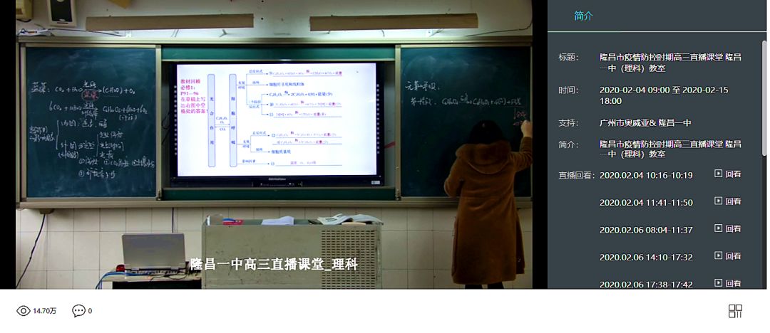2月1日開始,隆昌市教體局在奧威亞錄播教室支撐下,開展全市高三文理科和初三在線課程教學,目前已覆蓋全市多所學校,受益學生超8000多人,開通在線課程800多節(jié),截至3月1日,直播點擊量超3000多萬人次,最高觀看人數(shù)達到1萬多人。