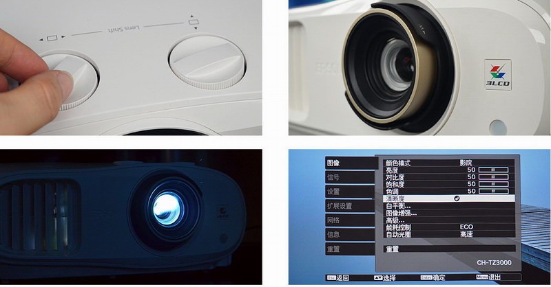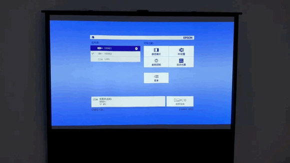 連上電源線,輕觸開機,我們先變焦和聚焦,隨后,旋轉鏡頭頂部的兩個位移旋鈕,屏幕可以向上下左右位移,不挪動投影機就可以調整畫面,居家安裝時很方便。愛普生投影機的主界面有常用功能的快捷按鈕,用戶操作起來比較直觀。功能界面很豐富,用戶可以詳細調整很多參數。