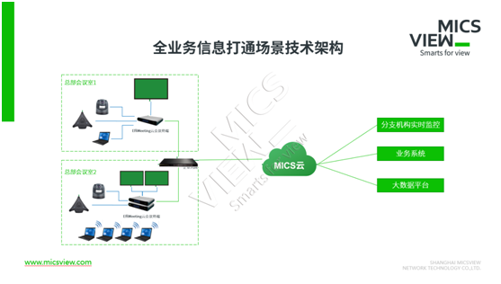 依托MICS云提供的公有云服務,企業只需在會議室配備終端,外部人員配備手機等移動終端,即可實現會議接入。