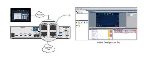 內置的 Extron IP Link® Pro 控制處理器,帶一個安全、專用的三端口視音頻局域網交換機和一個標準以太網接口。網絡交換機的 AV LAN 端口設計用于控制本地視音頻設備,能避免外部干擾或入侵。