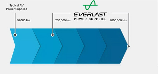 Everlast™ 電源由 Extron 自主設計及生產,采用超高品質的元器件以及高效的現代電源拓撲,提供了熱量管理、晶體管開關、能量耗散和電源系統的其它各項重要功能。每個 Everlast 電源都與我們獲獎的高端視頻產品一樣經過嚴格的測試以及細節方面的精心設計。該電源享有 7 年質保。