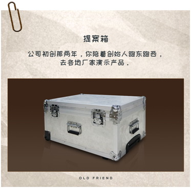 提案箱,您如今已在檔案室休息,不常出現在我們眼前。但是在我剛出生那兩年,您陪著創始人跑東跑西,去各地廠家演示產品,其中的辛苦早已由您那黯淡無光、不復“白皙”的銀質箱體無言地訴說著。