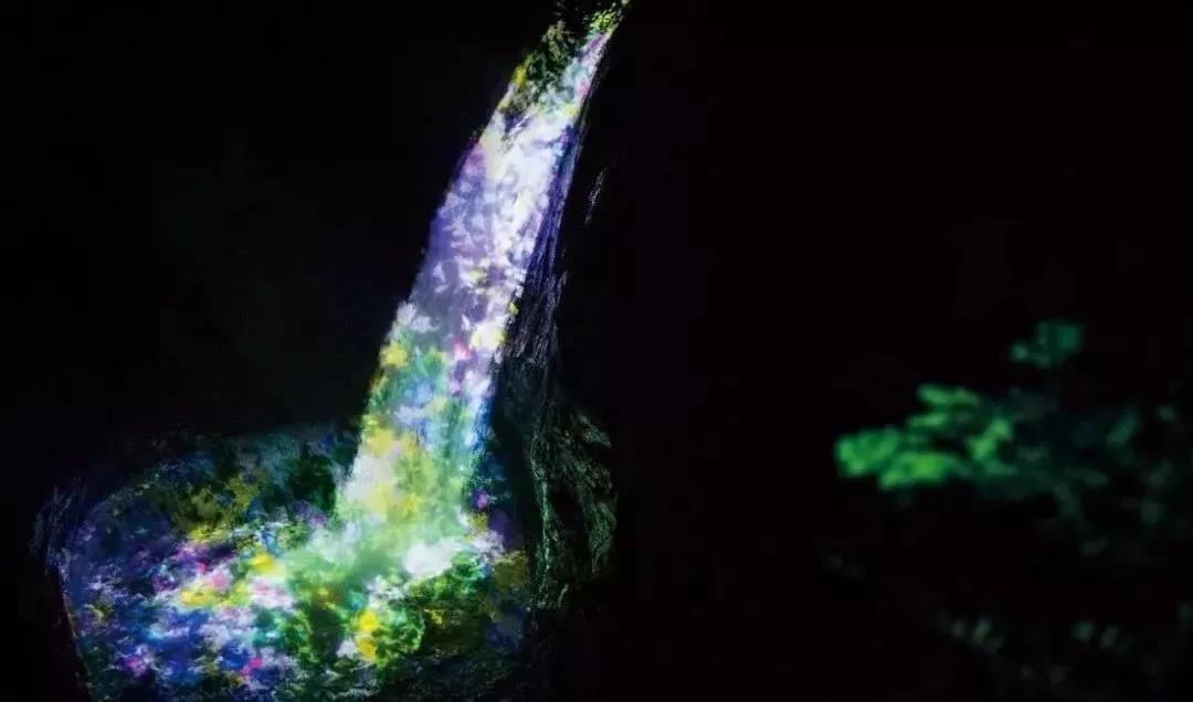 在水流強勁落下的瀑布上展現(xiàn)花朵從誕生、生長、結出花朵、開花到不久后的凋零、枯萎。通過水的動感與燈光的結合展現(xiàn)出生命的變化與炫彩之光。