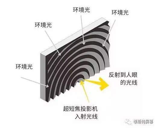 超短焦激光電視產品搭配光學屏幕,首推菲涅爾型光學屏幕,這種光學屏幕利用菲涅爾光學結構原理能夠有效抵抗室內環境光以及窗戶環境光對畫面造成的黯淡,有效將投影機的亮度均勻分布在屏幕正面,從而使觀看者獲得最佳對比度的圖像。