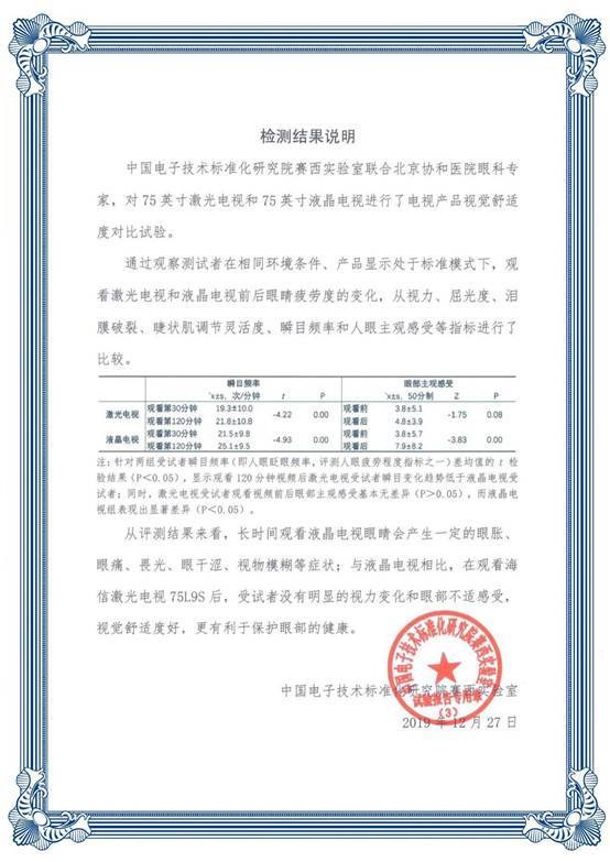 北京協(xié)和醫(yī)院眼科專家和中國電子技術(shù)標(biāo)準(zhǔn)化研究院賽西實(shí)驗(yàn)室,兩大國家級(jí)權(quán)威機(jī)構(gòu)選取海信激光電視作為檢測產(chǎn)品,共同從屈光度測試、淚膜破裂時(shí)代、調(diào)節(jié)靈活度測試、瞬目頻率統(tǒng)計(jì)等方面,對(duì)人眼疲勞度和舒適度的變化差異做出判定。