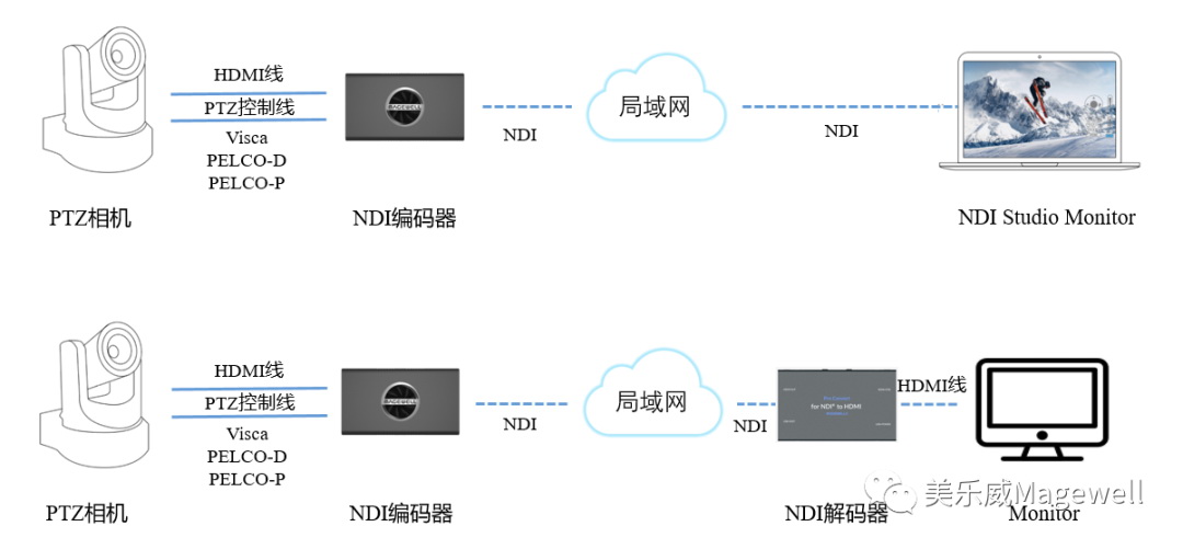 而有些PTZ相機,并不具備RJ45網口,用戶可以通過Visca/PELCO-D/PELCO-P協議接收美樂威Pro Convert 系列NDI編碼器轉換后的PTZ指令。這種情況下PTZ相機通過HDMI線和PTZ控制線(Mini Din8接口)連接NDI編碼器。NDI的解碼端可以是美樂威的NDI解碼器或者是整合了NDI PTZ控制功能的軟件。具體設備連接方案如下圖所示: