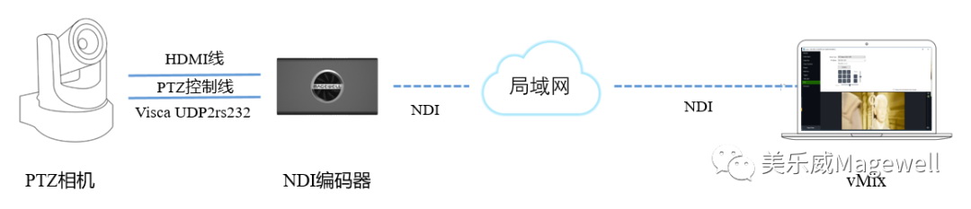 此外,有一些軟件雖然支持NDI的解碼,但沒有整合NDI PTZ控制的功能,如vMix軟件。這類用戶可以使用美樂威NDI編碼器即將發布的固件中支持的Visca UDP2rs232協議來實現對應對云臺的控制。其設備連接和控制邏輯與使用Visca/PELCO-D/PELCO-P協議相似,具體設備連接方案如下圖所示: