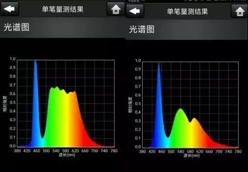 其實并不是所有的藍光都是有害的,真正有害的是400到440nm以內的藍光。而激光電視所搭配的抗光幕可自動過濾波長在450nm以下的藍光。從以下的光譜圖可以直觀的表明顯示設備的發光情況,其中橫坐標表示波長(頻率),縱坐標則表示相對強度,在讀圖時通過藍光的高度我們就可以確定顯示設備是否藍光過剩,同時從橫坐標我們可以讀出藍光的波長,從而判斷它對人眼的危害大小。