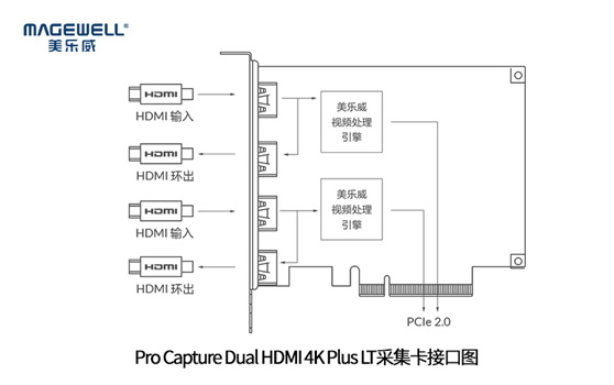 Pro Capture Dual HDMI 4K Plus LT還配有HDMI環出接口,即在采集雙路4K視頻信號的同時,通過使用HDMI環出接口,降低工作流的成本和復雜度。HDMI環出接口使每一路4K視頻信號可以同時被傳輸到顯示器或其他設備,無需增加外置HDMI分流器。(產品詳情:http://cn.magewell.com/products/pro-capture-dual-hdmi-4k-plus-lt)