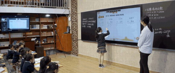 如老師可邀請授課教室的一名學生和遠程聽課教室的一名學生,同時在一體機上進行板書答題,雙方板書同步。