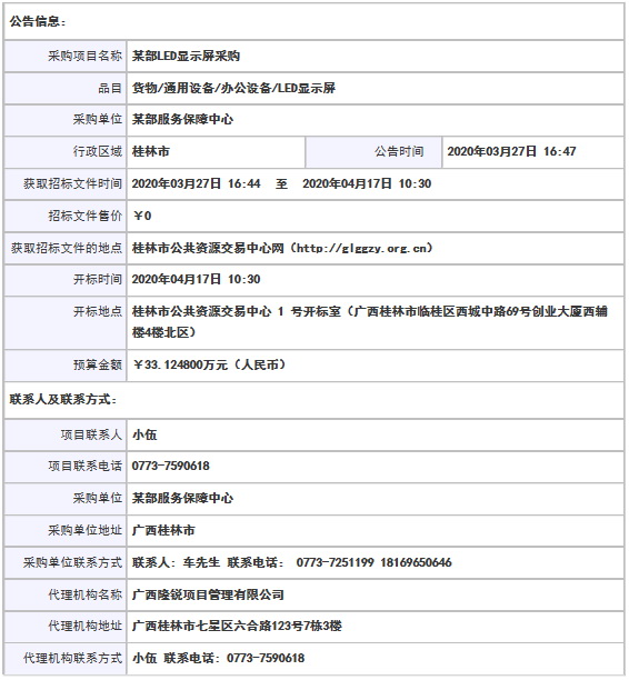 采購項目名稱: 某部LED顯示屏采購 采購品目: 貨物/通用設備/辦公設備/LED顯示屏