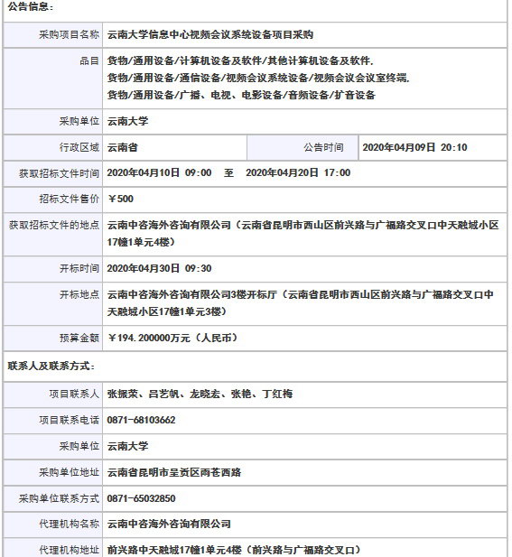 采購項目名稱: 云南大學信息中心視頻會議系統設備項目采購