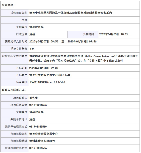 采購項目名稱: 滄縣中小學(xué)幼兒園液晶一體機精品錄播教室系統(tǒng)創(chuàng)客教室設(shè)備采購
