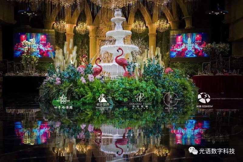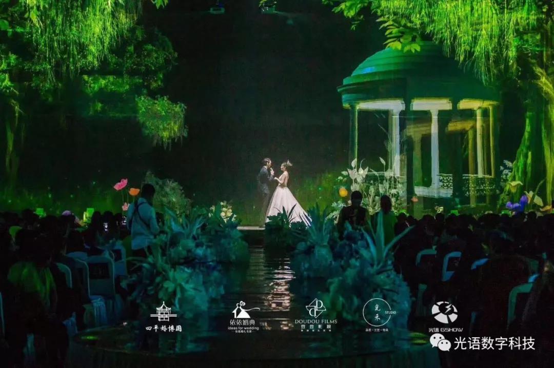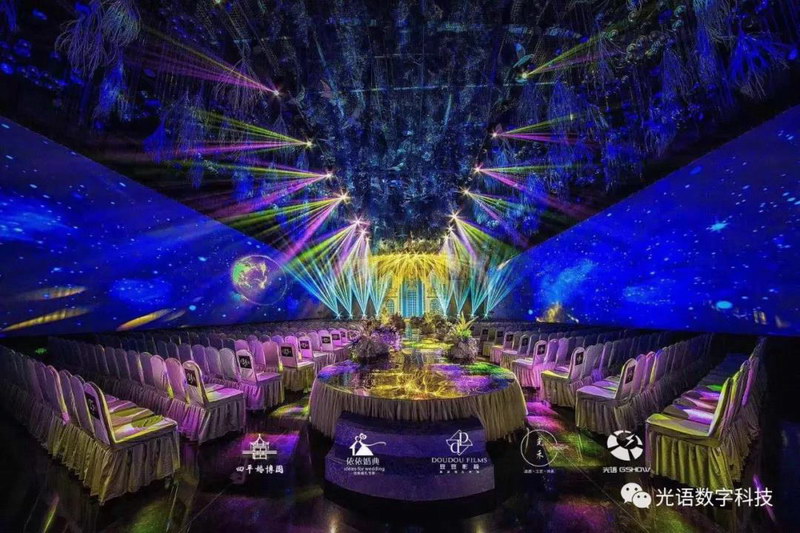 四平婚博園重磅打造的5D全息婚宴,由深圳光語數字全程策劃設計與安裝調試,現場采用光語GSHOW專業級舞臺燈光音響設備,使宴會廳呈現出劇場現般的完美音視,讓場面更加震撼,讓感受更加身臨其境!