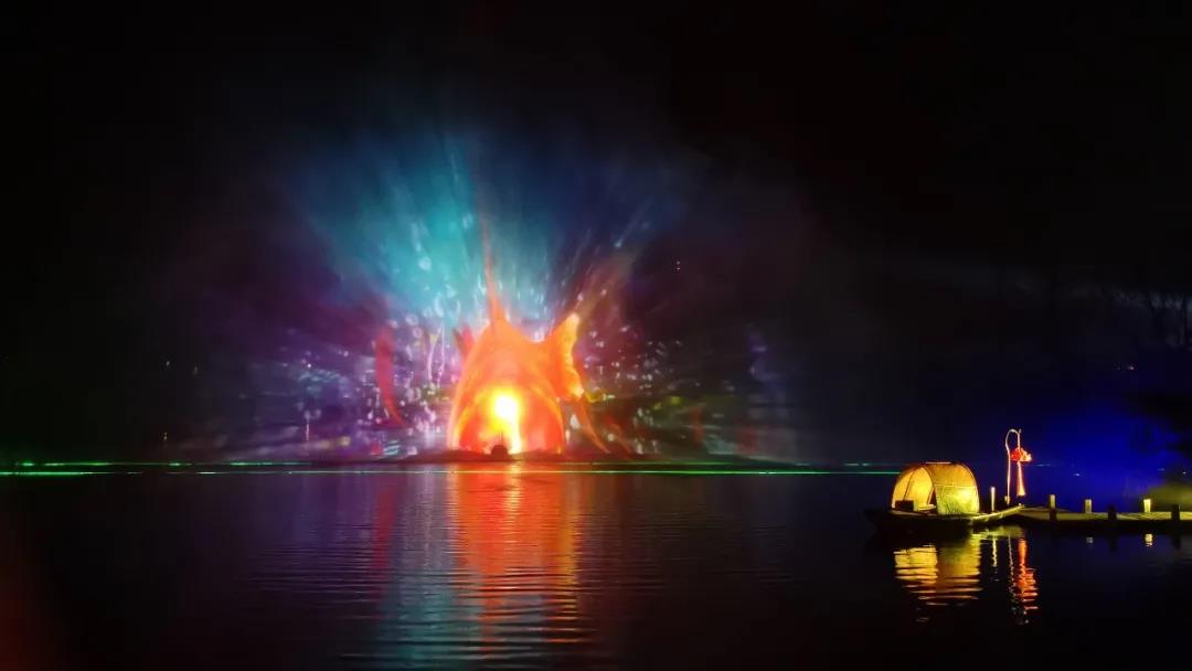 就在觀眾不經意時,一條火紅的錦鯉躍然而出,又猛地扎進湖面,畫面栩栩如生,十分連貫。